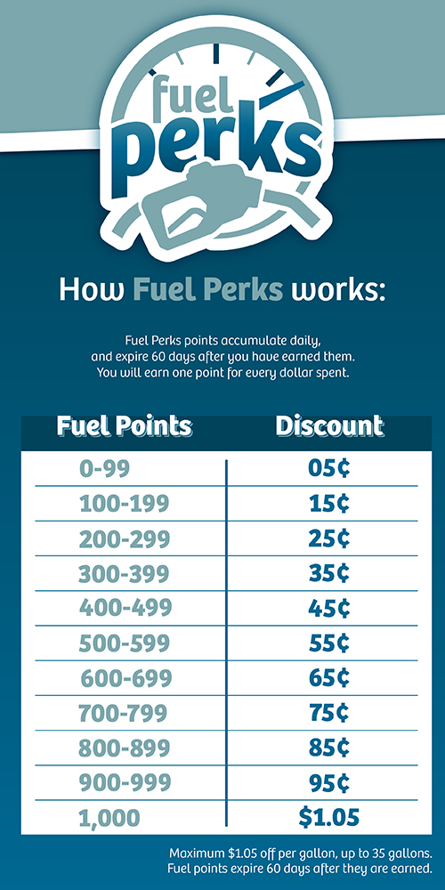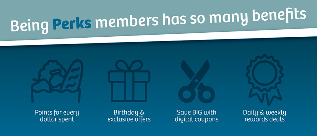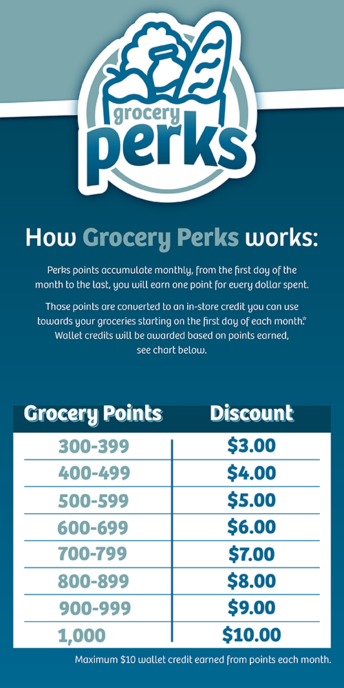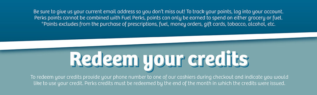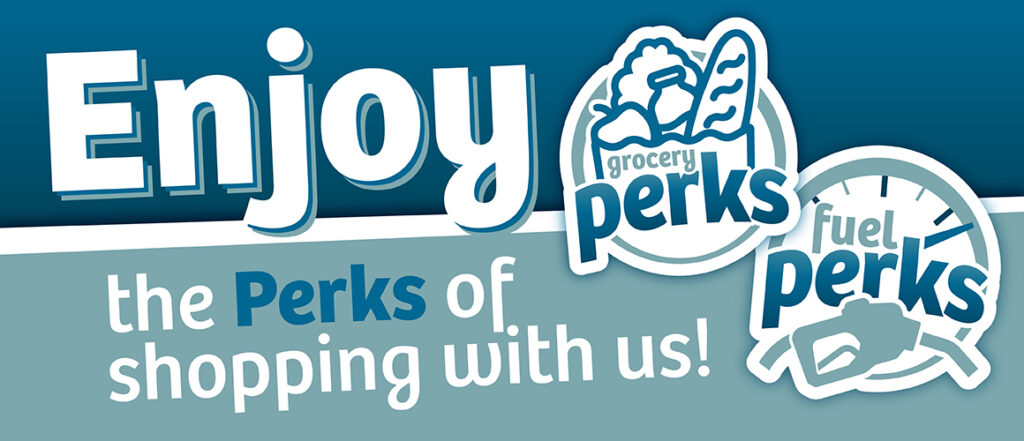 Our Perks program is a great way to save money and earn awesome deals on groceries. The more you spend at any of our grocery locations, the more you save. There are two ways to spend your Perks: choose either groceries or fuel. Use your Perks phone number every time you shop to earn a wallet credit or discounts at the pump. Every dollar spent = 1 Perks point. Learn more about grocery Perks here. Learn more about Fuel Perks here.