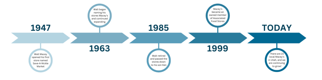 In 1947, Walt Macey and Dale A. Jones opened the ‘Save-A-Nickel Market’ in Rose Park, Utah, with a vision of delivering great food and exceptional service to their community. From those small beginnings, Macey’s has grown into a trusted local grocery store, serving over 20 communities across Utah. Now part of Associated Food Stores, we remain dedicated to the same values of service, quality, and care that started it all. Whether you’re shopping for fresh, dependable groceries or enjoying the personalized service we’re known for, Macey’s is proud to continue our legacy as your neighborhood grocer.