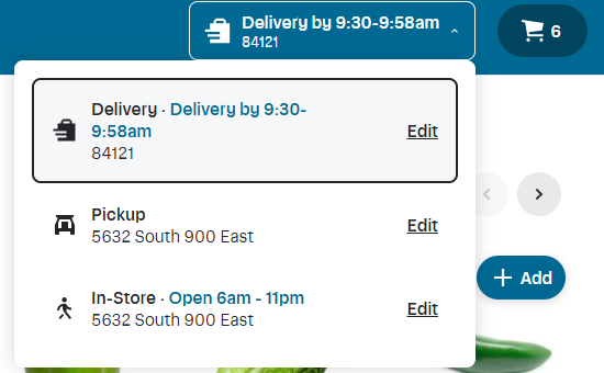 Once you select Delivery there will be an EDIT icon. Select EDIT and you have the opportunity to select which location you want to order from. Once selected, click Shop This Store