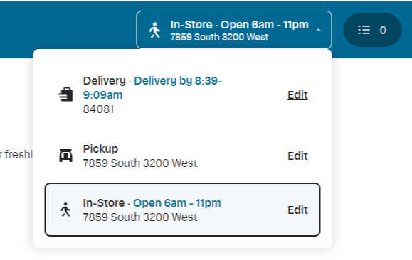 At the top of the website or App you can select: Pick Up, Delivery, or In-Store