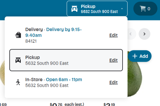 At the top of the website or App you can select: Pickup, Delivery, or In-Store